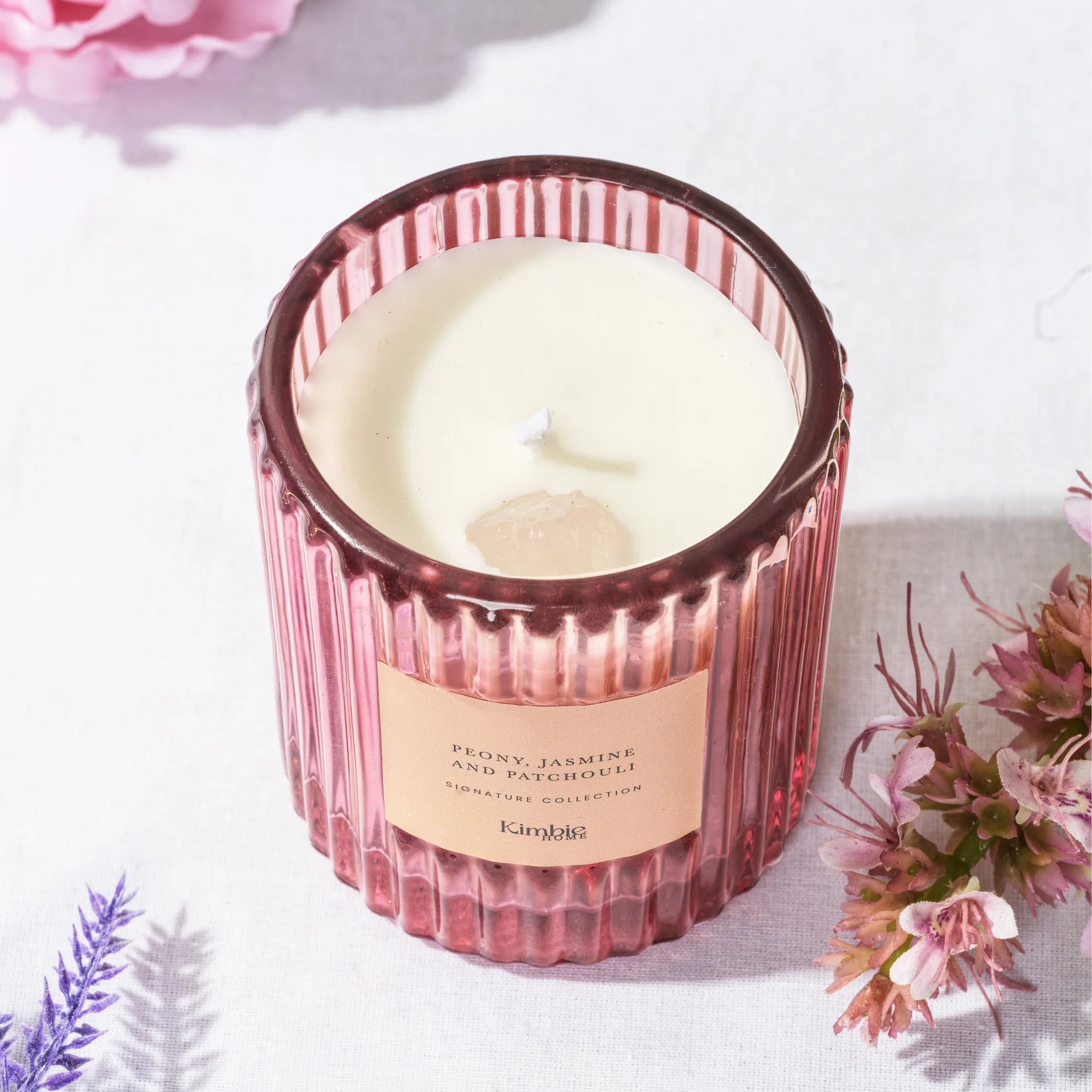 Experience everyday luxury with the Kimbie Home Pink Signature Candle, a 180g hand-poured soy wax candle infused with 60 carats of Raw Rose Quartz, for a touch of natural beauty and serene energy. Delicate yet sophisticated, this candle opens with the soft floral elegance of peony, leading into a romantic heart of jasmine, carnation, and rose. The fragrance deepens into a warm, grounding base of leather and patchouli, creating balance between light floral notes and rich earthiness. Perfect for moments of calm or gifting, this candle brings beauty, serenity, and elegance to any space.